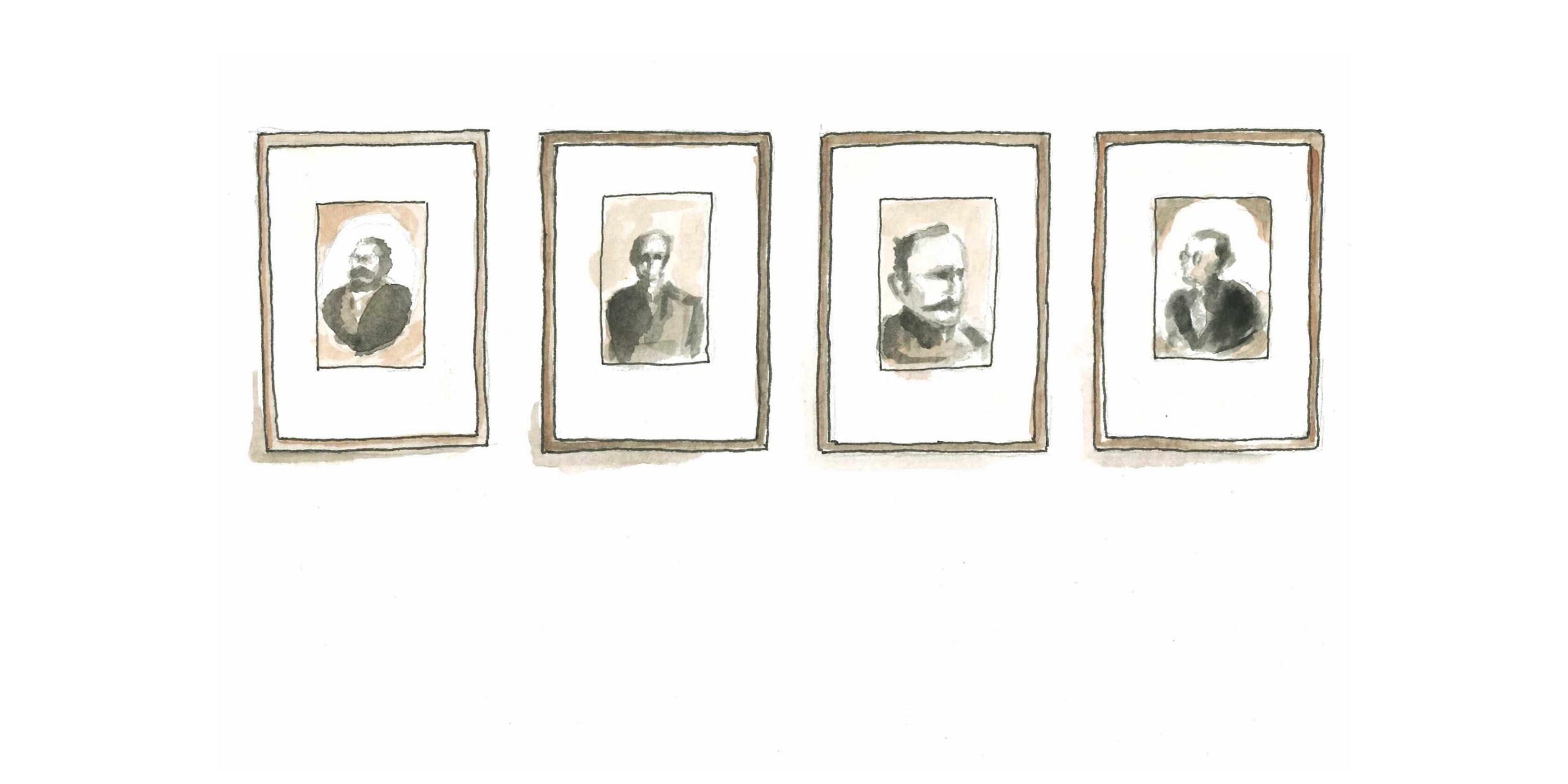 Im Treppenaufgang des Historischen Seminars hängt eine lange Reihe von Porträts Heidelberger Historiker. Über die Daseinsberechtigung einzelner Bilder wird diskutiert