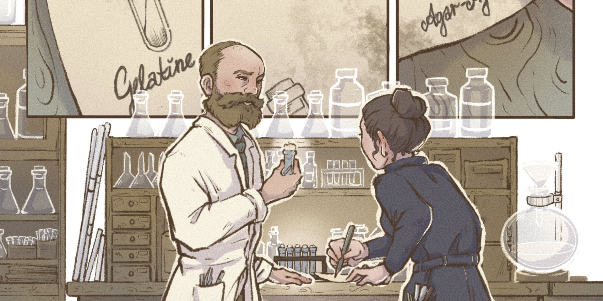 Mit Wasserfarben hatte Fanny Angelina Hesse die auf Agar wachsenden Bakterien präzise fesgehalten. Die Zeichnungen belegen ihr tiefgreifendes Verständnis der Forschung. Im Museum des Robert-Koch-Instituts sollen die Zeichnungen nun auch ausgestellt werden. Die Biographie ist laut Corrado Nai und Frank Hesse zu persönlich, um diese als Paper zu veröffentlichen, doch Corrado hat eine Idee: Auch beim Agar ginge es darum, Unsichtbares, wie Bakterien, sichtbar zu machen. Mit einer Graphic Novel könnten die Entdeckungen Fanny Angelina Hesses für möglichst viele Menschen greifbar werden. „Ich habe noch nie eine Graphic Novel geschrieben“, merkt Corrado an, aber er stellt sich der Herausforderung. Mittlerweile hat er ein Team aus Illustrator:innen und Historiker:innen, die parallel entwerfen, illustrieren und die Biographie wissenschaftlich aufbereiten. Über die Crowdfunding-Seite „Kickstarter“ sammelten sie bereits genug Geld, um eine Kurzfassung der Graphic Novel zu finanzieren. Neben typischen Comics verwendet das Team auch ausgefallene Agar-Kunst. Dabei werden farbige Mikroben auf dem Nährmedium angeordnet, sodass sie zu einem Bild verwachsen.