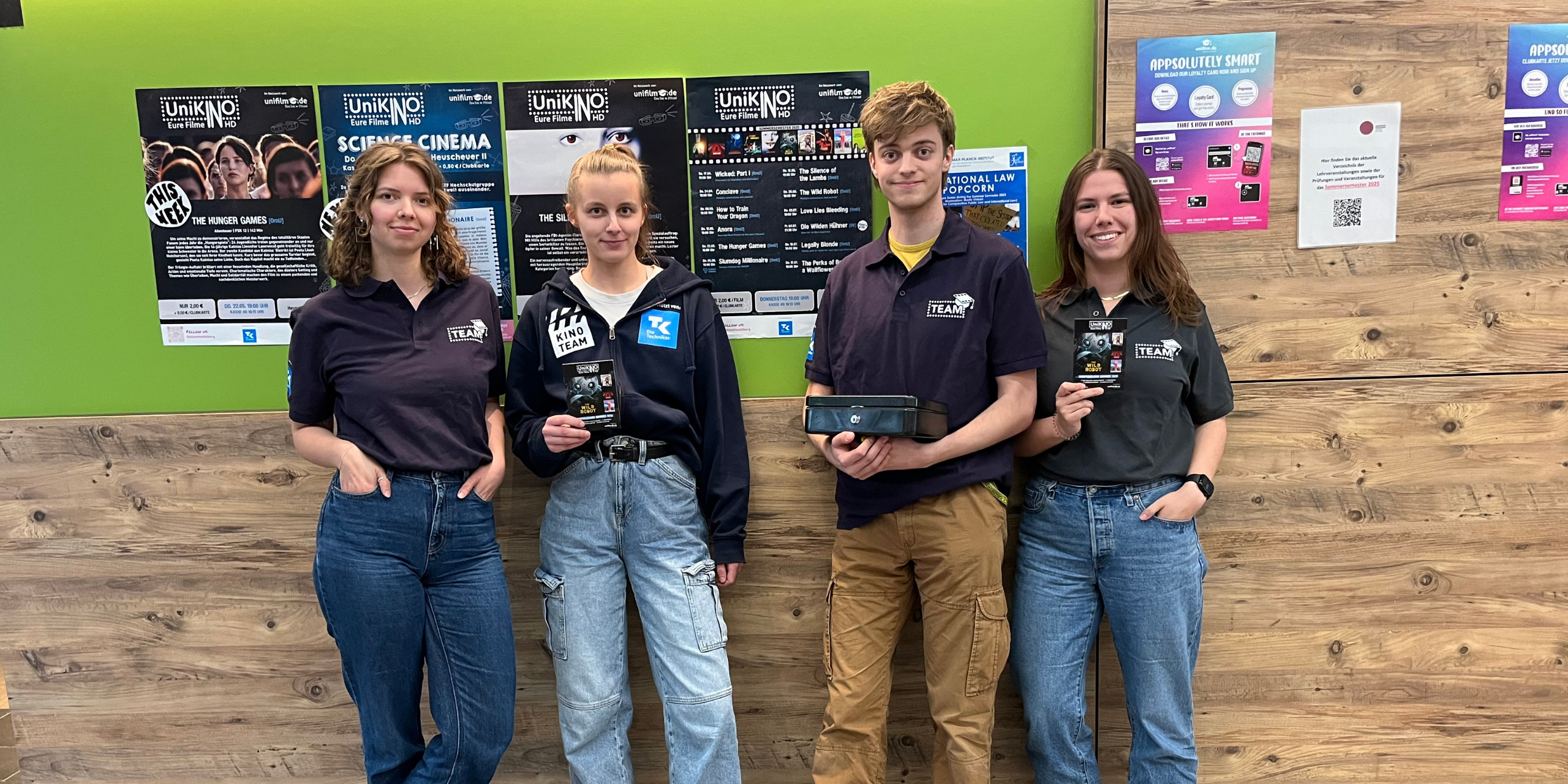 Während unten am Eingang noch Karten verkauft werden, wird im Hörsaal schon einmal die Technik zum Laufen gebracht. Für einen reibungslosen Ablauf rund um die Vorführung sorgt dabei das studentische Organisationsteam des Unikinos. Eine von ihnen ist Physik-Studentin Noa. Sie stellt das Team vor und erklärt die Arbeitsteilung innerhalb der Gruppe: „Der harte Kern, das sind so fünf bis sechs Leute. Da hat auch jeder seine feste Rolle und dann läuft das Teamwork sehr routiniert“. Drumherum würden immer mal wieder ein paar andere Studierende helfen, wie beispielsweise beim Plakatieren und Flyer austeilen.