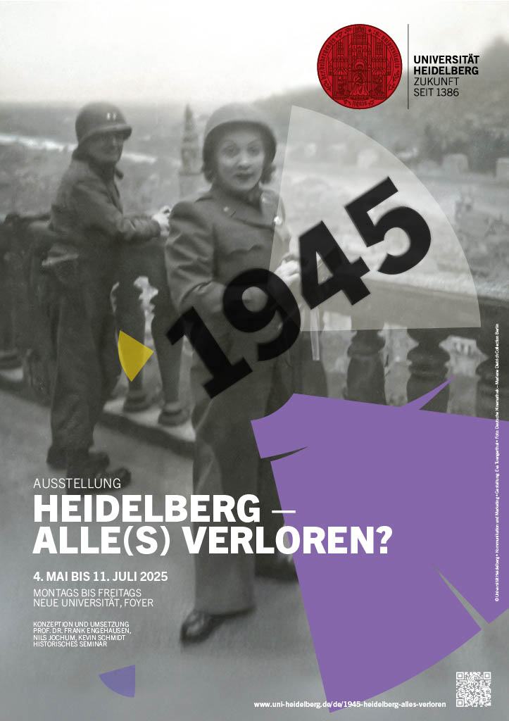 Was bedeutete das Kriegsende für die Menschen in Heidelberg? Welche Erfahrungen, Hoffnungen und Widersprüche prägten ihren Alltag im Jahr 1945? Diesen Fragen widmet sich die Ausstellung „1945: Heidelberg – Alle(s) verloren?“, die derzeit im Foyer der Neuen Universität zu sehen ist. Konzipiert wurde die Ausstellung von Doktorand:innen des Historischen Seminars in Zusammenarbeit mit Prof. Dr. Frank Engehausen, der Kommunikationsabteilung des Rektorats sowie einer Berliner Ausstellungsagentur. Insgesamt waren rund 50 Personen an der Ausstellung beteiligt.