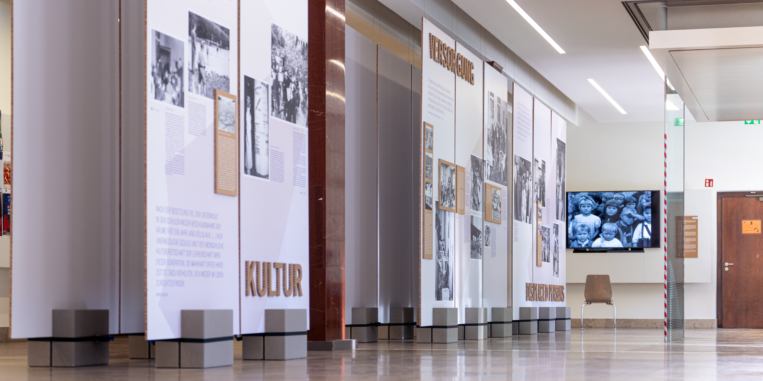 Ziel war es auch, den Foto- und Filmaufnahmen wortwörtlich breiten Raum zu geben. Große Kartontafeln, fixiert an Steinblöcken, nehmen das Foyer ein. „Zusammen mit dem Karton, aus dem die Tafeln bestehen, sollen sie auch ein wenig die Stimmung aufgreifen, die aus vielen Bildern spricht: das „Baustellenhafte“, das Provisorische, die „Ungewissheit“. Das Historische Foto- und Filmmaterial steht also im Mittelpunkt der Präsentation. Die Bilder wurden gemeinsam ausgewählt, diskutiert und mit Zitaten sowie begleitenden Texten ergänzt. Ein Bild, das Jochum besonders im Kopf geblieben ist, zeigt einen unterernährten Säugling in der Universitätsklinik – aufgenommen 1947. Das Foto „zeigt, wie prekär die Ernährungs- und Versorgungslage noch lange Zeit war“ berichtet Jochum. Die Resonanz ist bisher sehr positiv. „Immer wieder sehen wir auch, dass sich neben Studierenden auch ältere Personen oder Touristen die Tafeln anschauen. Das alles freut uns sehr, denn wir möchten mit der Ausstellung ein breites Publikum erreichen“, berichtet Jochum. Sein Kollege Kevin Schmidt hat die Website der Ausstellung bereits im Schulunterricht eingesetzt. Interaktion, Kritik und Rückmeldungen sind von den Ausstellungsmacher:innen ausdrücklich erwünscht. „Wir haben uns dazu entschlossen, die historischen Foto- und Filmaufnahmen für sich sprechen zu lassen“, sagt Jochum abschließend. „Die Ausstellungen hier im Foyer soll zeigen, welche Konsequenzen Krieg selbst nach dem Ende für die Menschen hat. Dabei kann einem bewusst werden, wie wertvoll ein Leben in Frieden und Freiheit ist und wie wichtig es ist, beides zu bewahren oder aber wiederherzustellen.“