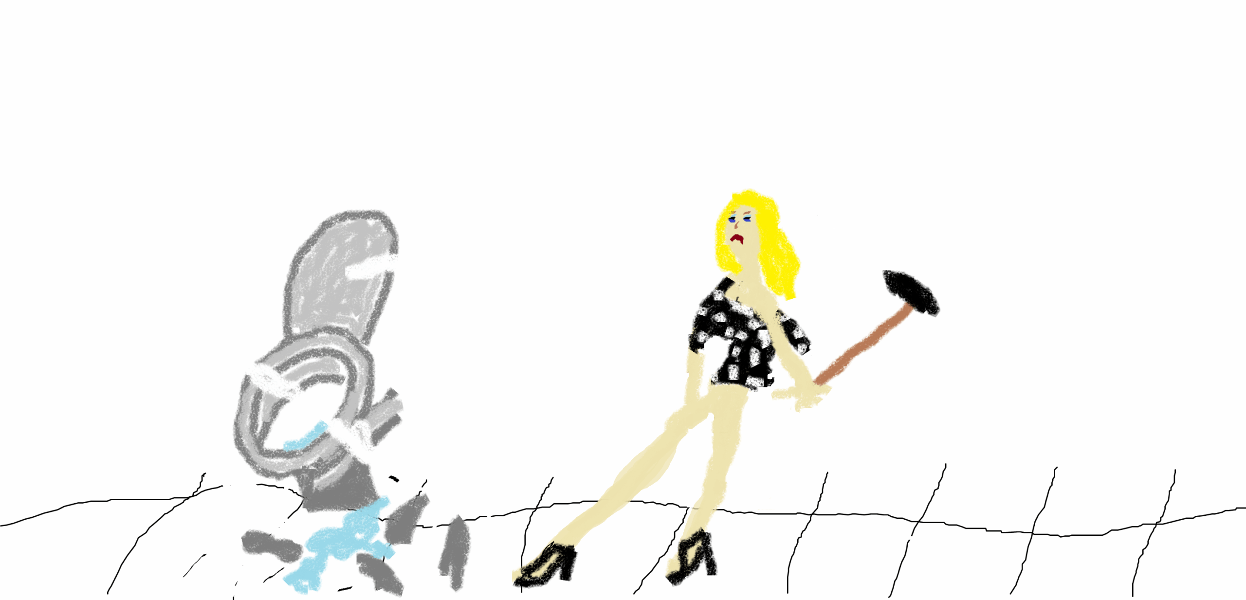 Und nun? Nach über vier Jahren ist die weibliche Schaufensterpuppe wieder zurückgekehrt. Die Darstellung ist noch provokanter als zuvor: Die langhaarige, blonde Perücke ist leicht zerzaust, ein billiger Reizwäscheslip hängt ihr zwischen den Beinen und noch nicht einmal vollständig bekleidet ist sie heute.