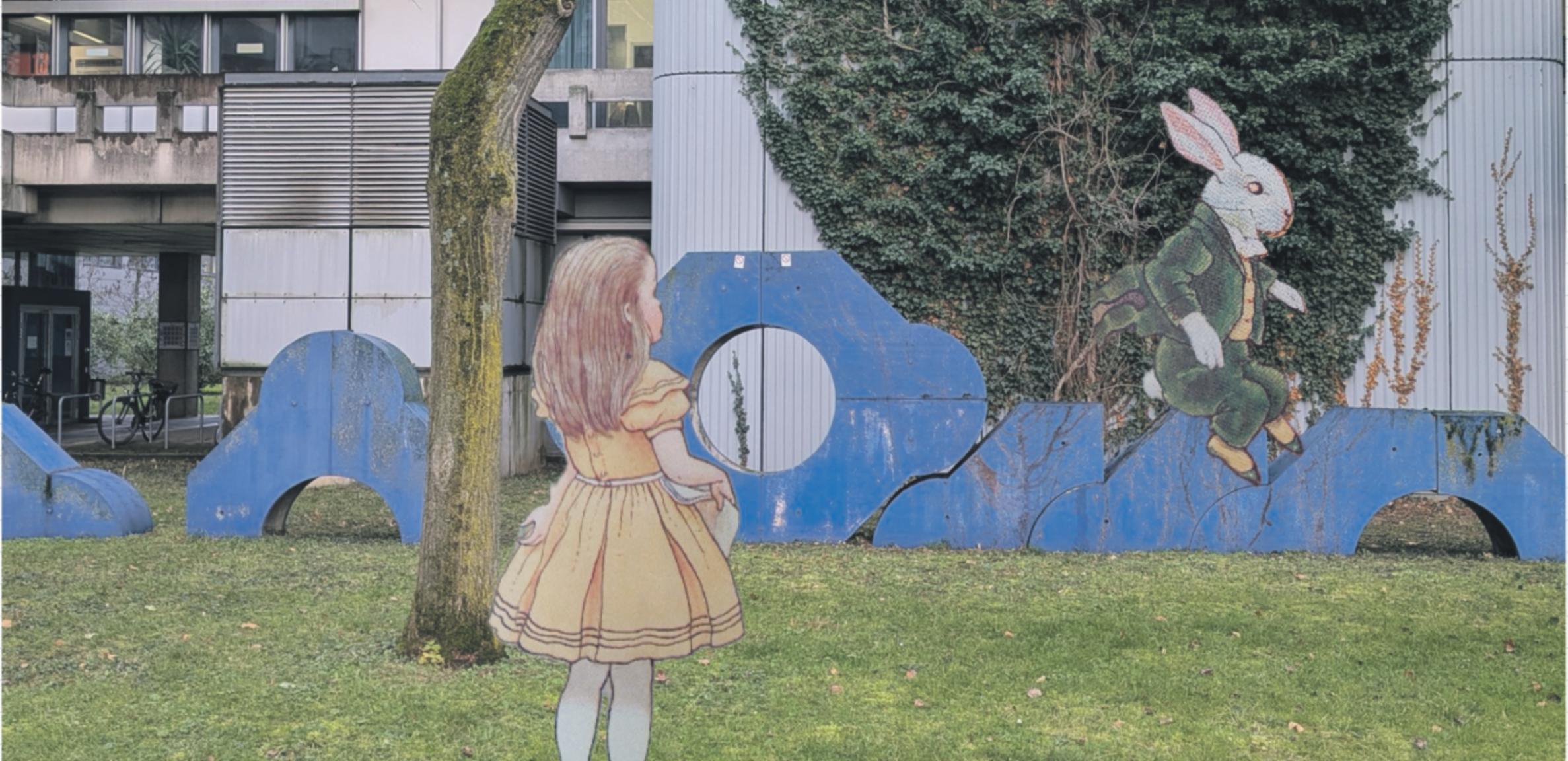Wenn das Neuenheimer Feld nicht schon durch den Charme der grauen Betonklötze, die sich Institute schimpfen, besticht, dann wohl durch die einmalige Gelegenheit, sich ins Wunderland entführen zu lassen! Seit einiger Zeit treiben nämliche mystische, kupfern glänzende Hasen ihr Unwesen auf der Baustelle des neuen Audimax. Getarnt als Kunstinstallation sind sie sicher nur darauf aus, unschuldige Student:innen in die Wunderwelt der Uni zu entführen!